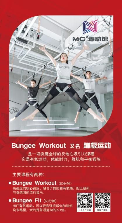 Bungee 是近年新兴的健身概念,利用对抗地心引力提升强度,与空中瑜伽不同的是,空中瑜伽是利用钩挂在柔软的布上用尽全力运动,而Bungee Fitness使用的是类似高空的弹跳绳,利用弹性拉力来辅助运动,方式相对容易,燃脂效果特别好,在10分钟的练习中就可以达到平时45分钟的有氧运动效果!这是因为Bungee Fitness都是悬挂在半空中完成的,是集有氧运动,体能耐力,腹肌和平衡锻炼的综合体。任何微小的动作都需要对抗弹力绳的阻力,并且因弹力跳跃带来的刺激感,会分泌更多的肾上腺素,这样就使人在愉悦的感受中加快代谢,在不知不觉中可以将过多的热量完全消耗。